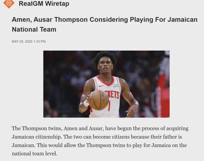 今天据美媒《RealGM》报道,阿门·汤普森(火箭)和奥尔萨·汤普森(活塞)两兄弟计划代表牙买加男篮出战FIBA比赛。